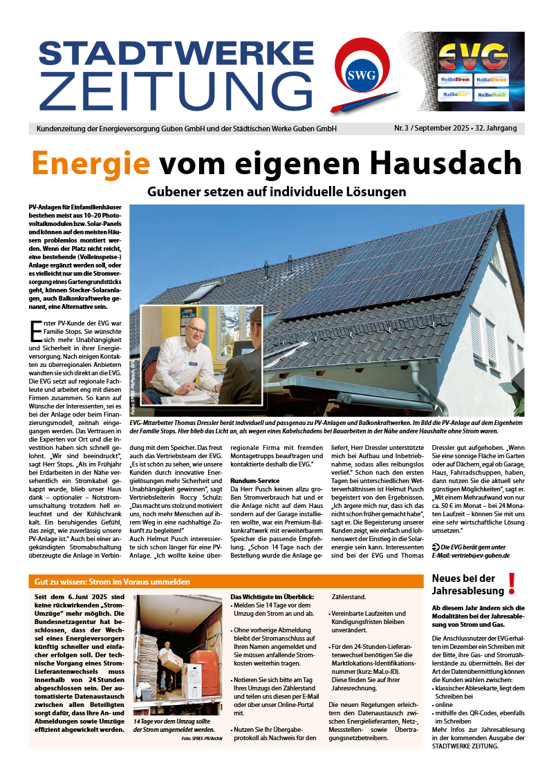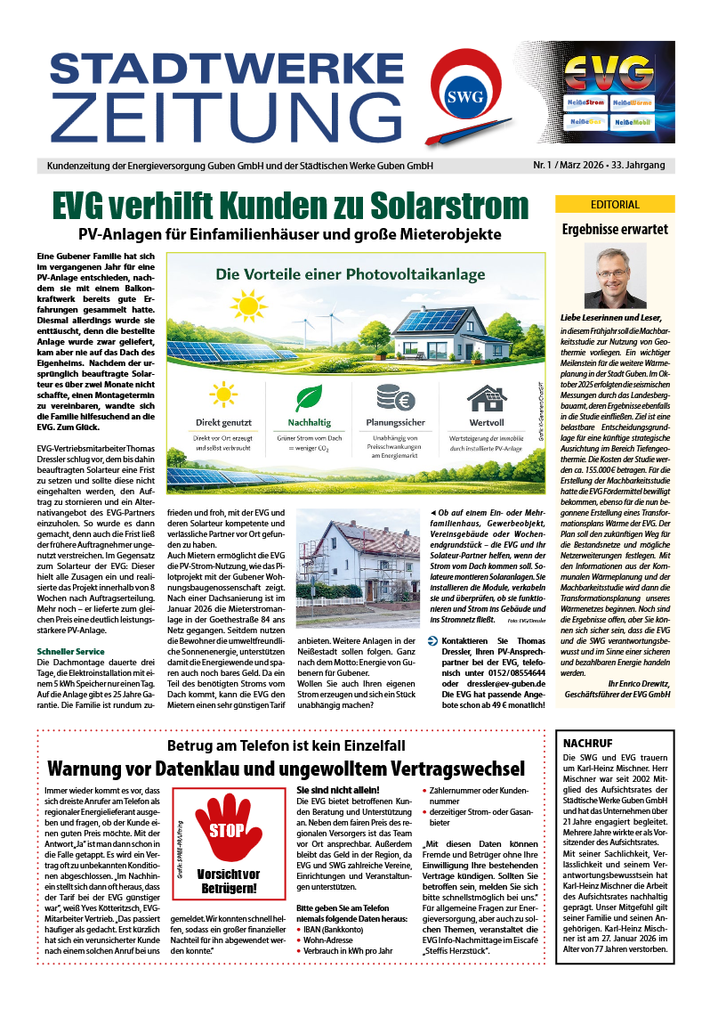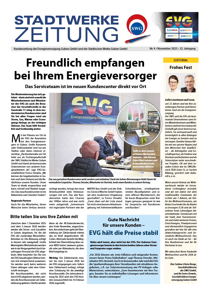 Auf Grund vermehrter Nachfragen von Neukunden für Strom, Gas und Fernwärme weisen wir darauf hin, dass diese Energieträger über unser Tochterunternehmen, die Energieversorgung Guben GmbH bereitgestellt werden.